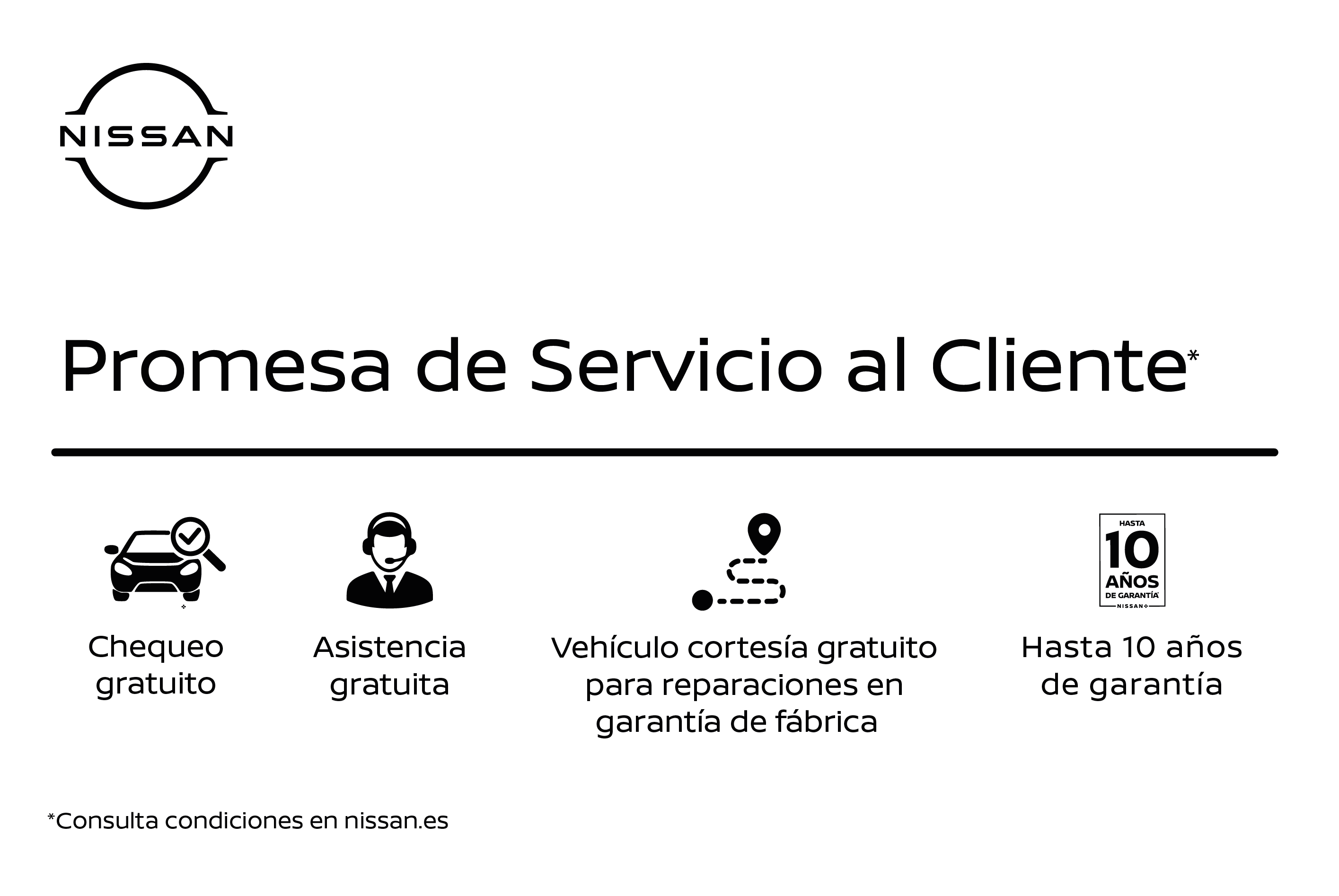 * Vehículo de cortesía gratuito para reparaciones en garantía de fábrica, nos comprometemos a ofrecerte movilidad mientras atendemos a tu Nissan en caso de reparaciones cubiertas por la garantía de fábrica. Si tu vehículo ya no se encuentra en el periodo de Garantía de Fábrica, no te preocupes, seguiremos garantizando tu movilidad por sólo 25€ al día.